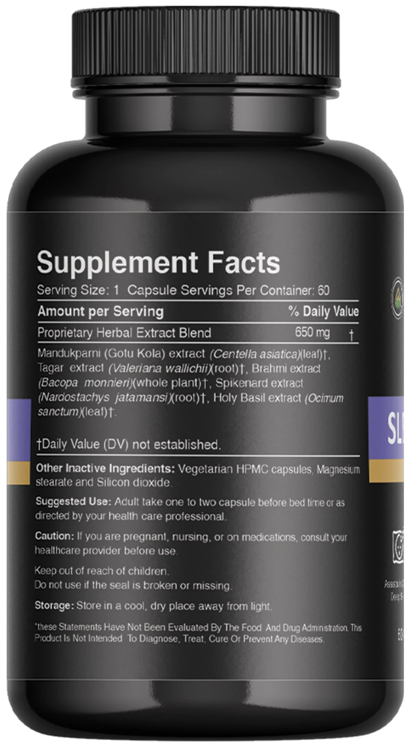 truveda Daily Sleep consists of potent herbal ingredients including Mandukparni (Gotu Kola) extract (Centella asiatica) (leaf)†,Tagar extract (Valeriana wallichii) (root)†,Brahmi extract (Bacopa monnieri) (whole plant)†,Spikenard extract (Nardostachys jatamansi) (root)†, and Holy Basil extract (Ocimum sanctum) (leaf)† to help you relax before bed and sleep soundly throughout the night.